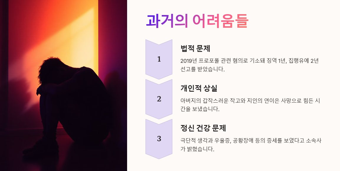 사실 휘성은 지난 몇 년간 여러 어려움을 겪어왔어요. 2019년에는 프로포폴을 12차례에 걸쳐 매수하고, 10여 차례 호텔 등에서 투약한 혐의로 기소돼 징역 1년, 집행유예 2년 선고를 받았죠.