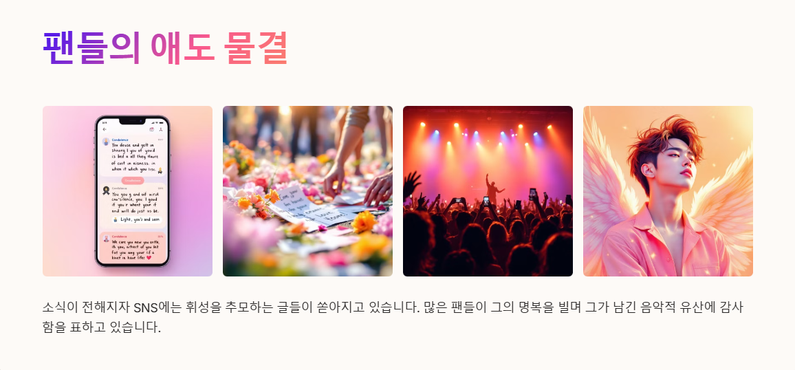 소식이 전해지자 SNS에는 휘성을 추모하는 글들이 쏟아지고 있어요. 많은 팬들이 그의 명복을 빌며 그가 남긴 음악적 유산에 감사함을 표하고 있습니다.