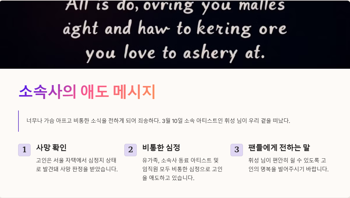 휘성의 갑작스러운 비보에 많은 팬들이 슬픔에 잠겨 있습니다. 그가 남긴 음악들은 앞으로도 오랫동안 우리의 마음속에 남아있을 거에요.