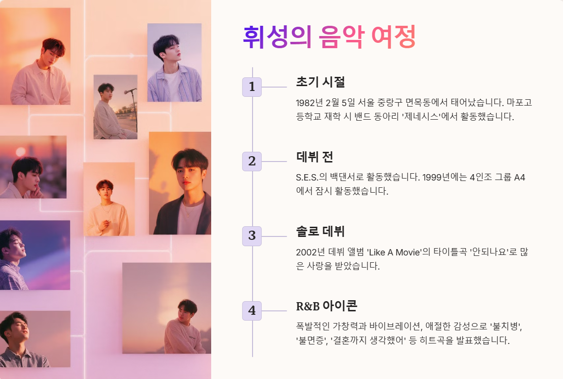 솔직히 말하자면, 휘성이 데뷔하기 전에 S.E.S.의 백댄서로 활동했다는 사실, 알고 계셨나요? 저는 최근에 알게 됐는데 정말 놀랐어요! 1999년에는 4인조 그룹 A4에서 잠시 활동하다가 이듬해 그룹에서 탈퇴했고, 2002년에 드디어 솔로 가수로 데뷔했죠.